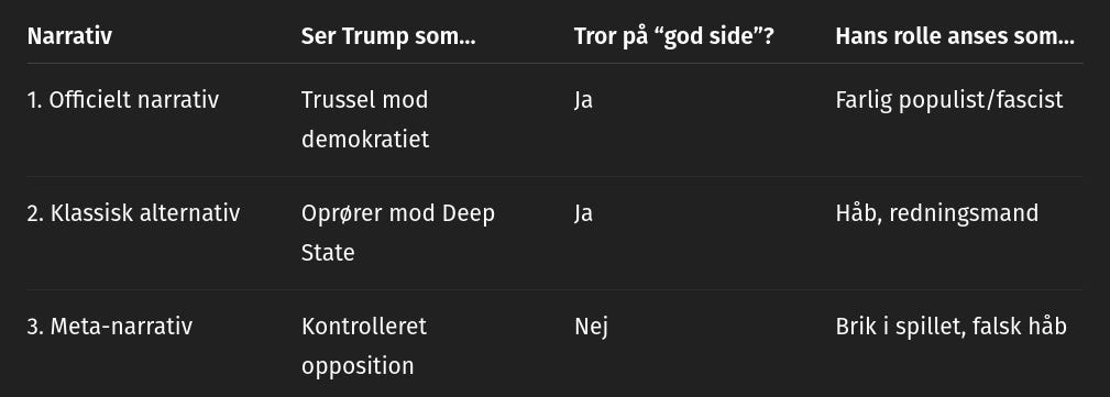 🧩 TRUMP GENNEM DE TRE NARRATIVER